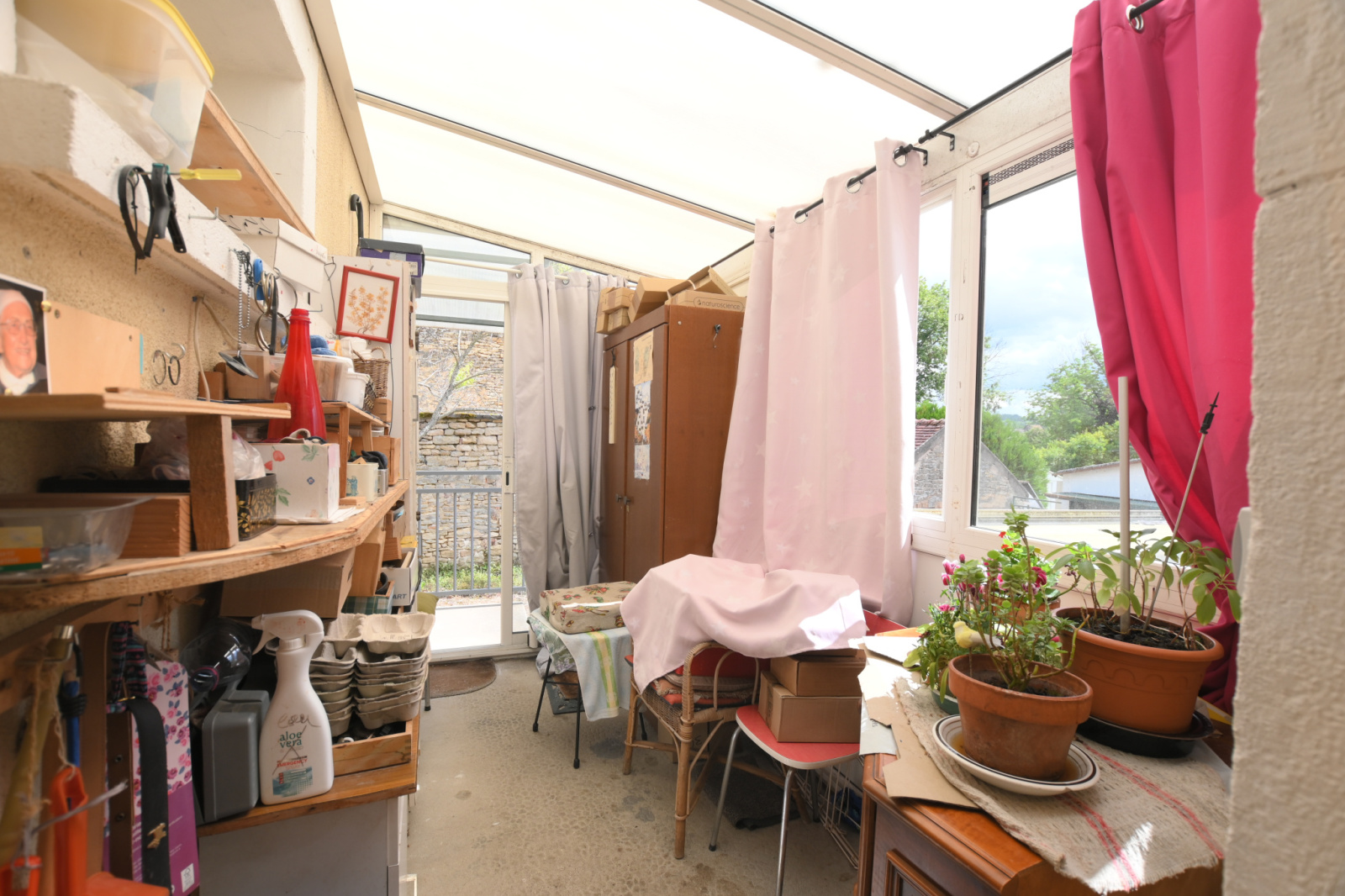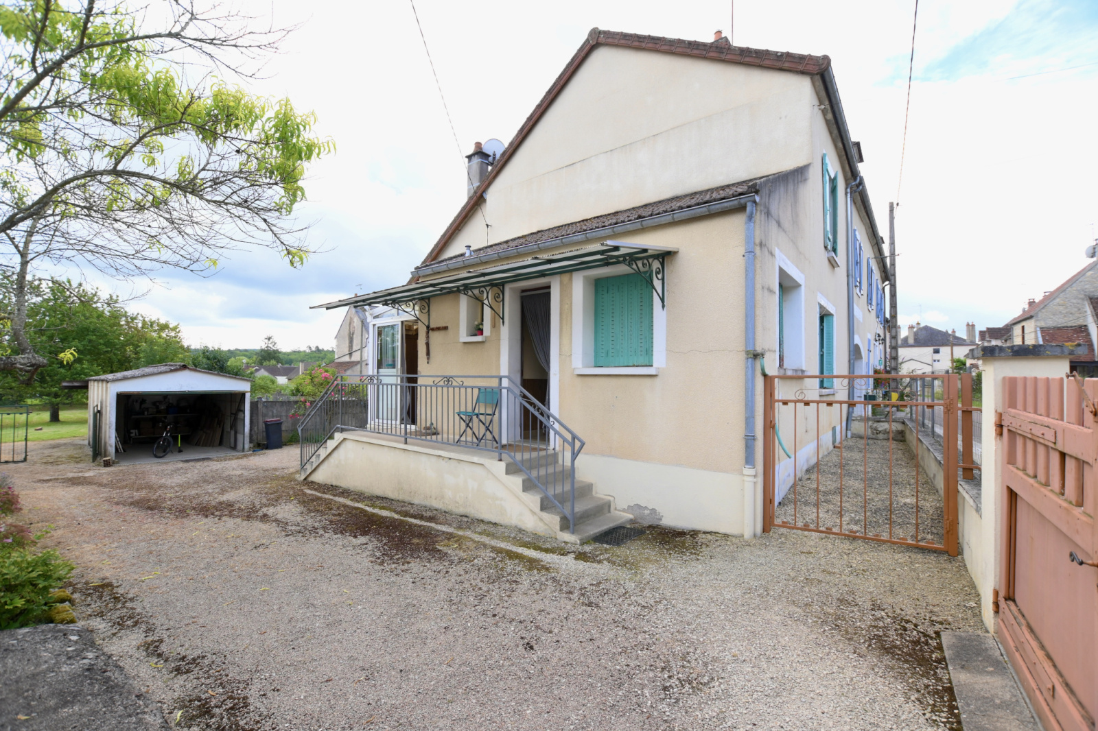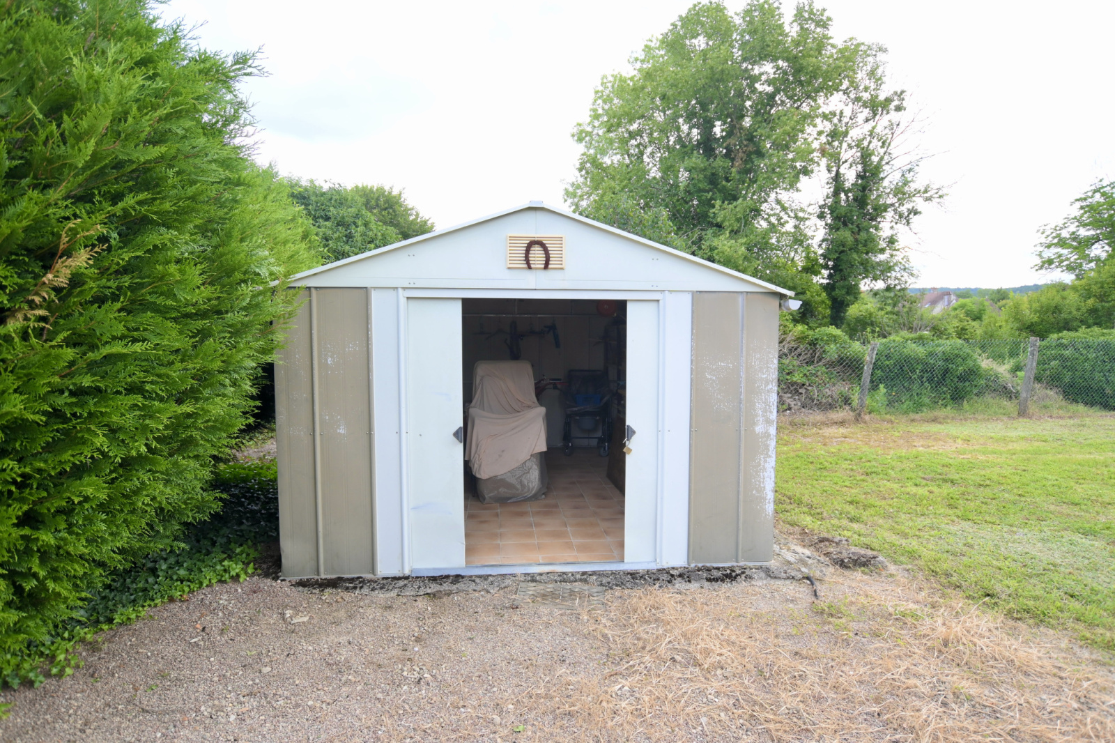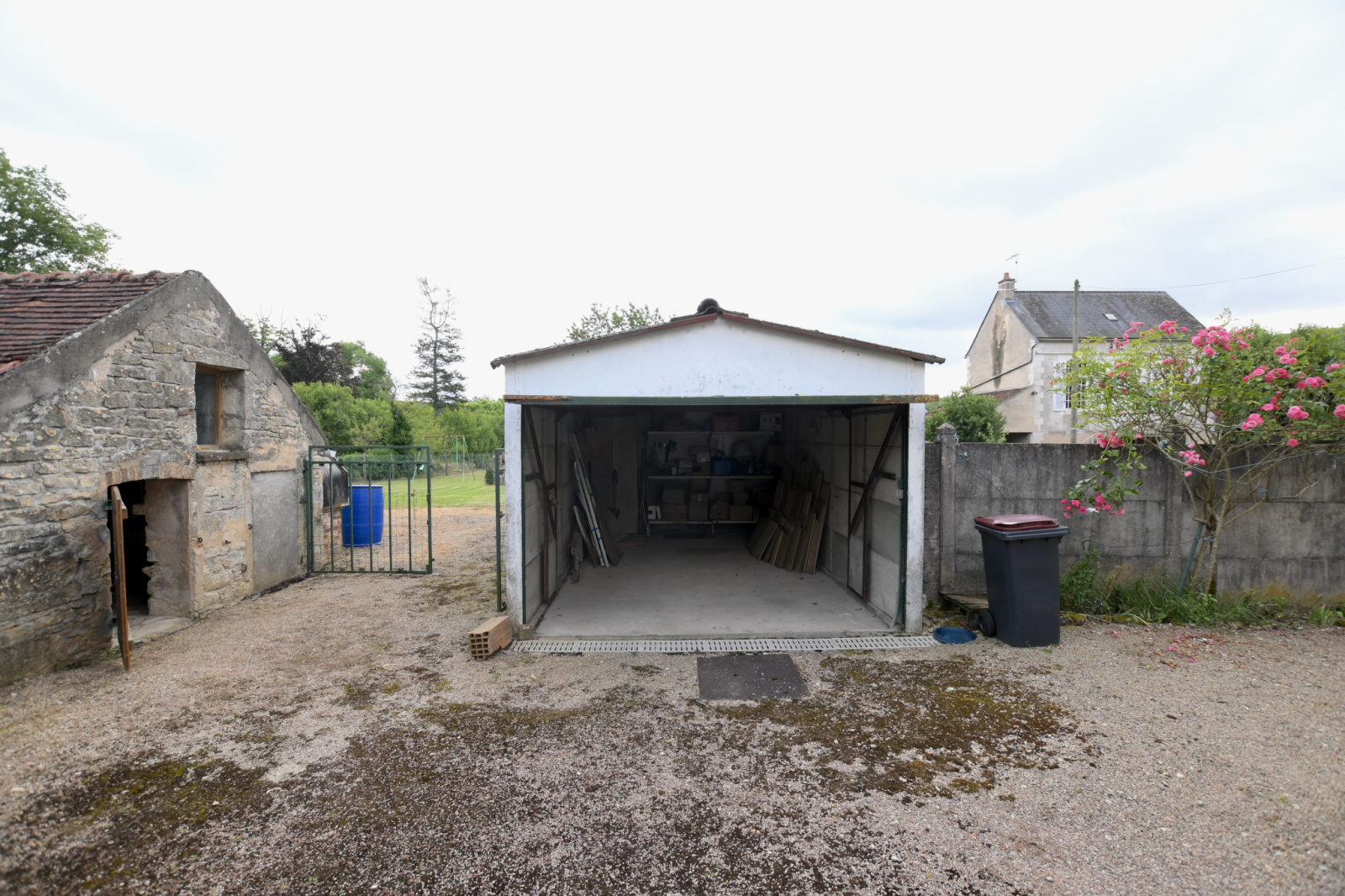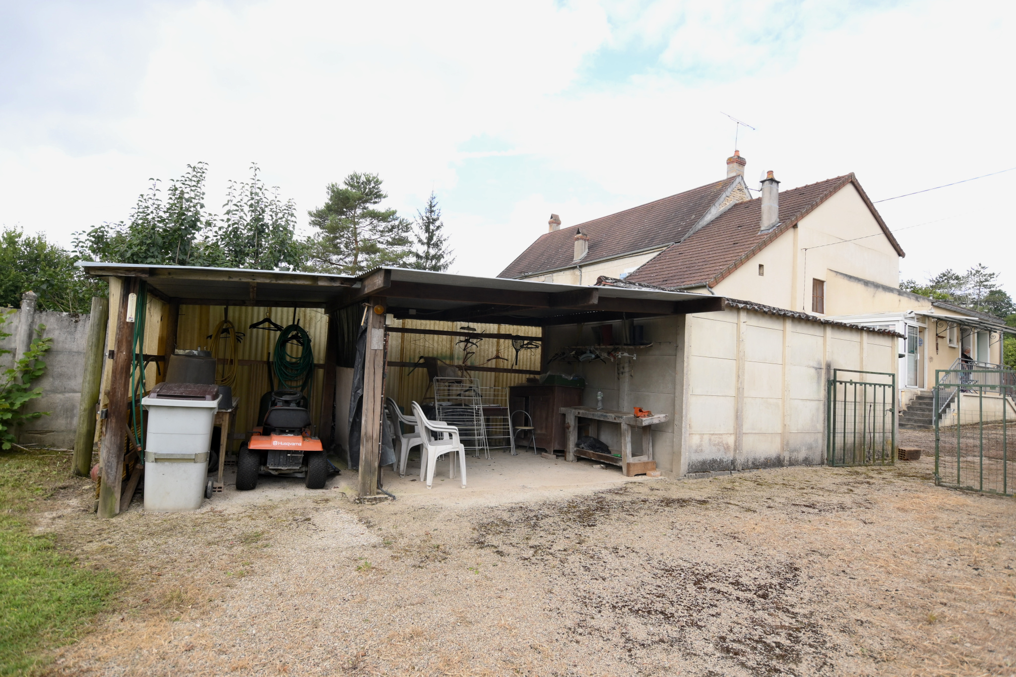 Cour, terrain arboré, un abri de jardin un garage et dancienne soue à cochon.
