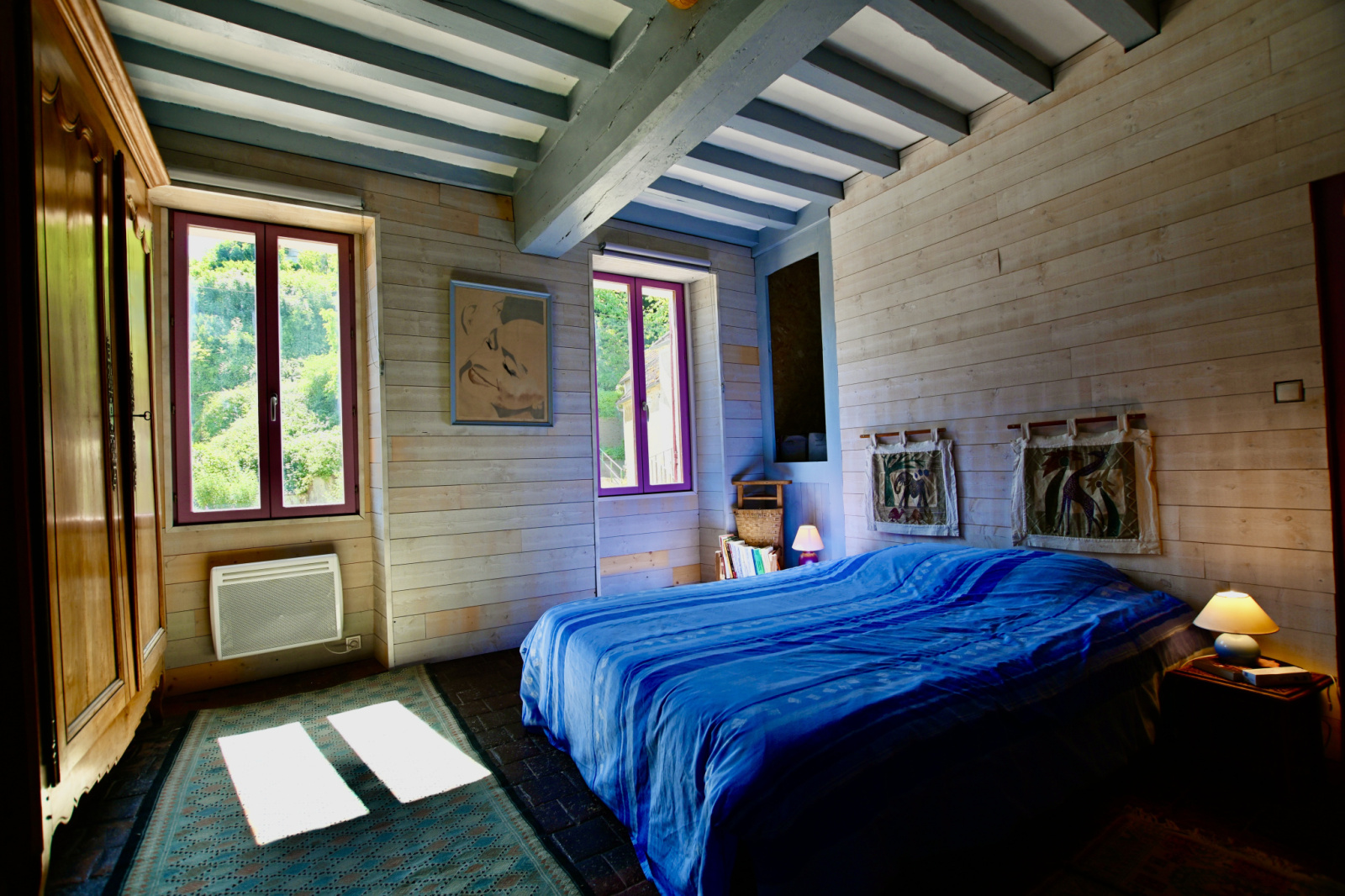 À l’étage, le palier distribue deux chambres, dont une avec salle d’eau et WC privatifs. Un demi-niveau supplémentaire révèle une troisième chambre au charme unique avec mezzanine, idéale pour un coin bureau ou une chambre d’enfant, et un grenier offrant encore un beau potentiel d’aménagement.