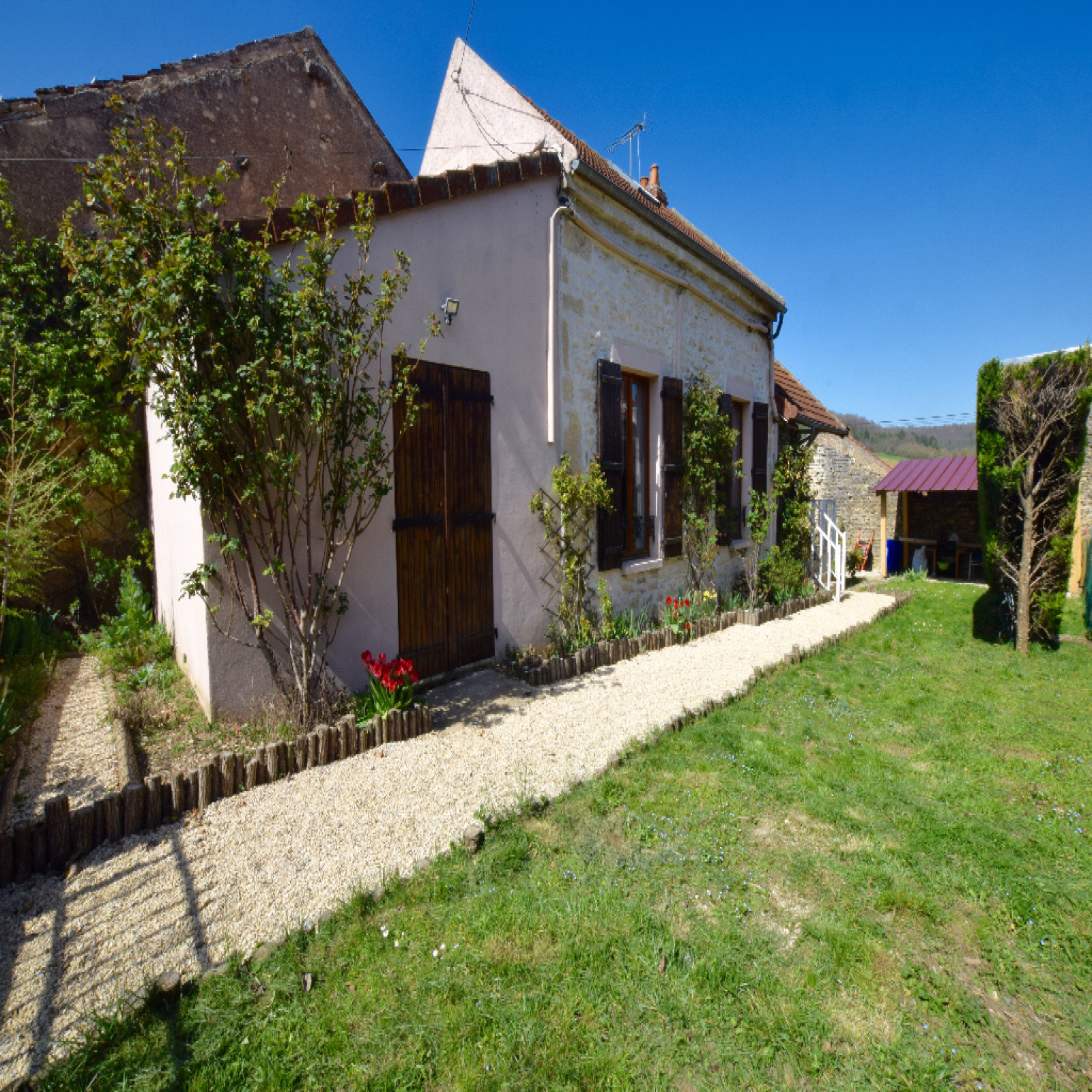 Dans le Vézelien charmante maison avec son terrain et un abri. L'habitation élevée en partie sur une cave comprend un patio, une entrée, une cuisine équipée dînatoire, une salle d'eau avec WC, un salon, une chambre avec grand placard, à l'étage une chambre mansardée avec son bureau. Le bien dispose de pompes à chaleur (clim réversible) et raccordé au tout à l'égout.